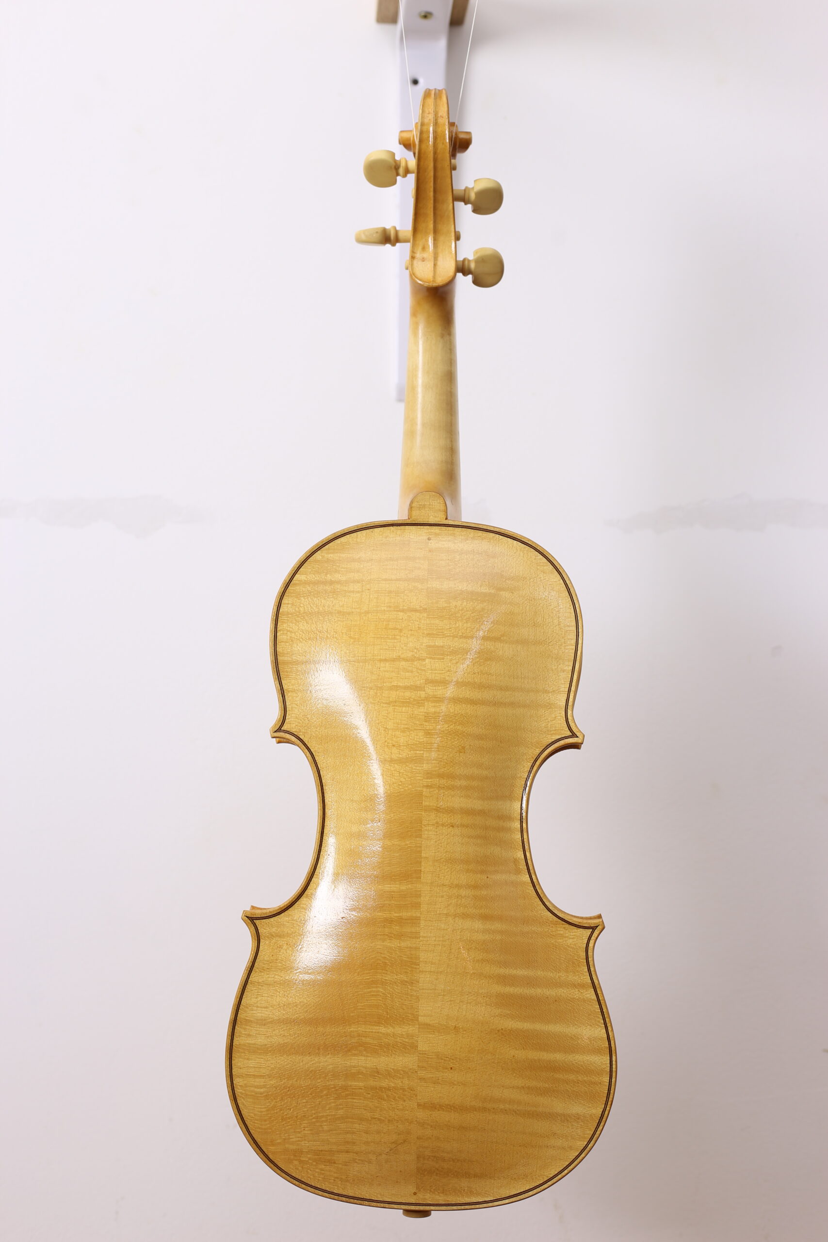 De viool is afgewerkt met een amber-olie lak (barnsteen) in een blonde kleurstelling.