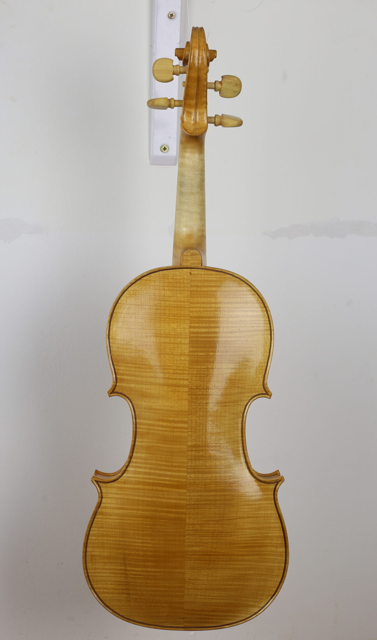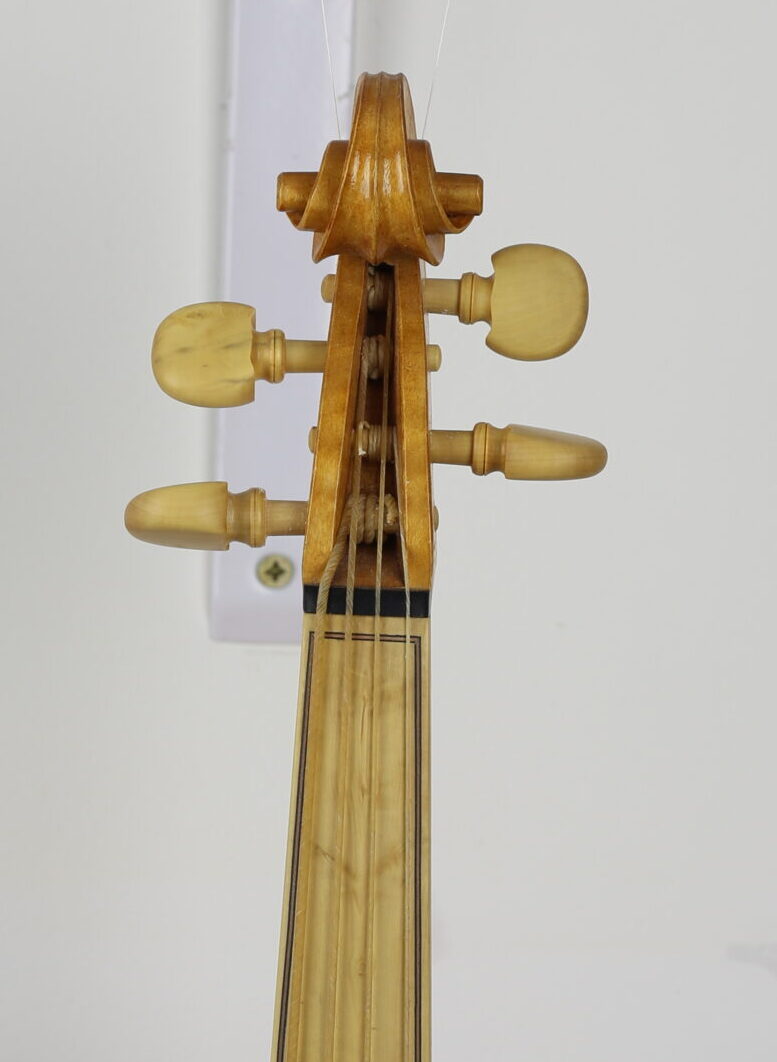 Gebouwd met inspiratie uit de Tiroler vioolbouw van de 17e eeuw denk aan Stainer, Albani en Klotz. Het staartstuk en de kam zijn gebaseerd op het schilderij Een Vrolijke Vioolspeler van Gerard van Honthorst. Afgewerkt met een barnsteen-olielak. Snaarlengte: 325 mm. stempennen handgedraaid van frans palmhout